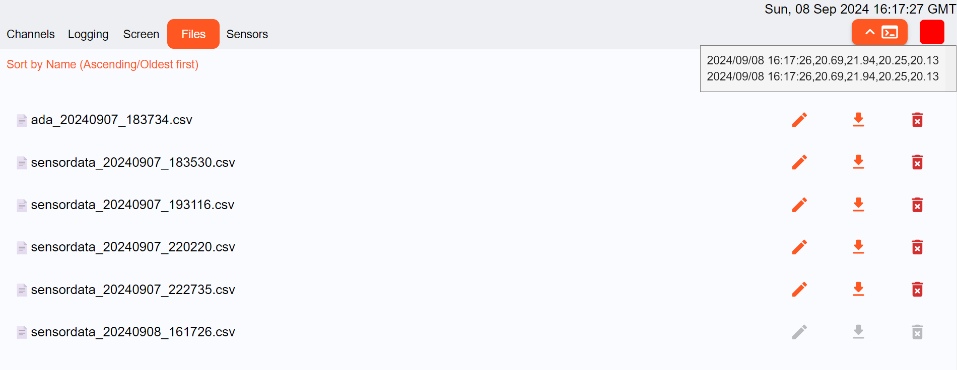 | SD card storage | Web fileserver for file transfers and .csv and .json files for persistence |